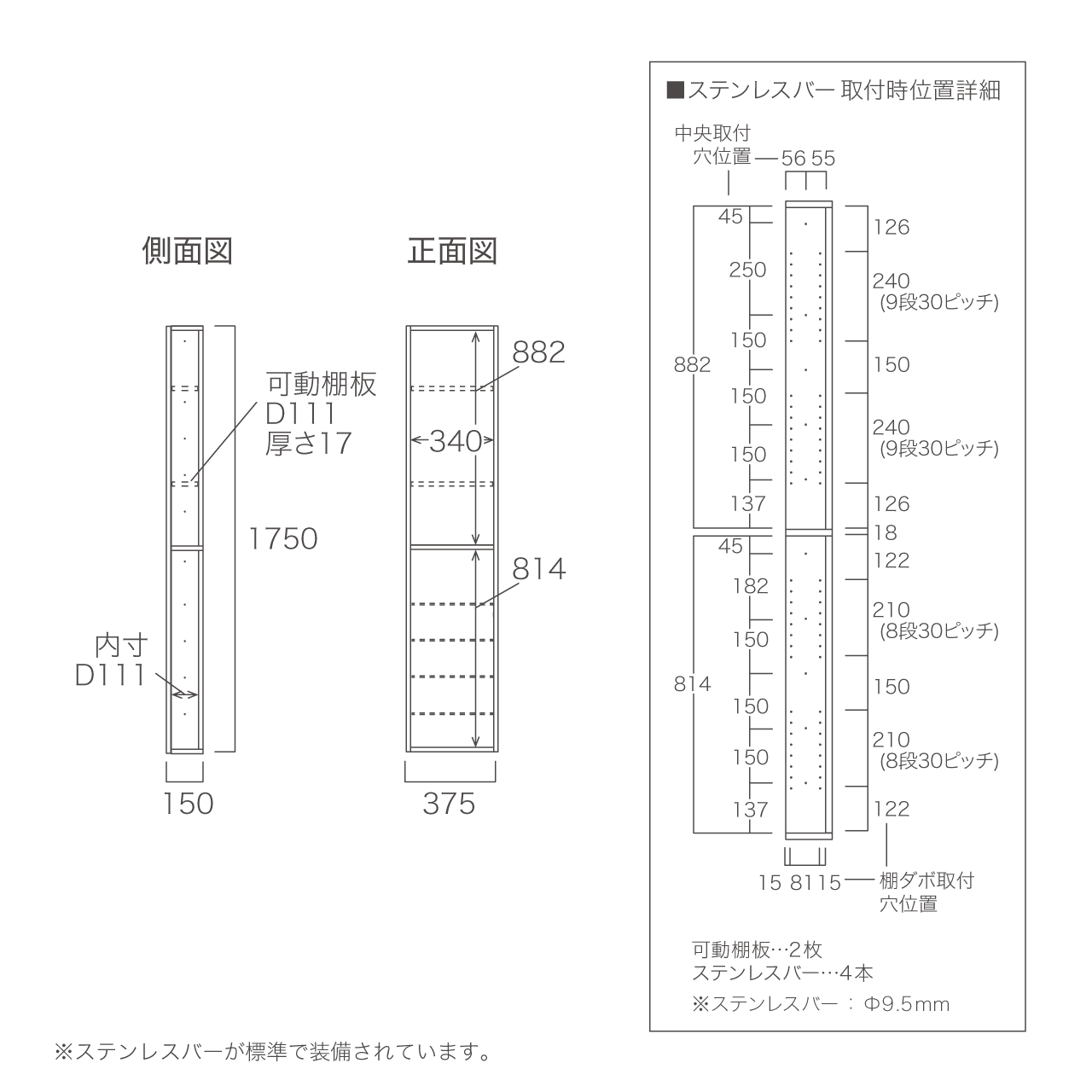 ステンレスバーが4本、可動棚板が2枚付属します。