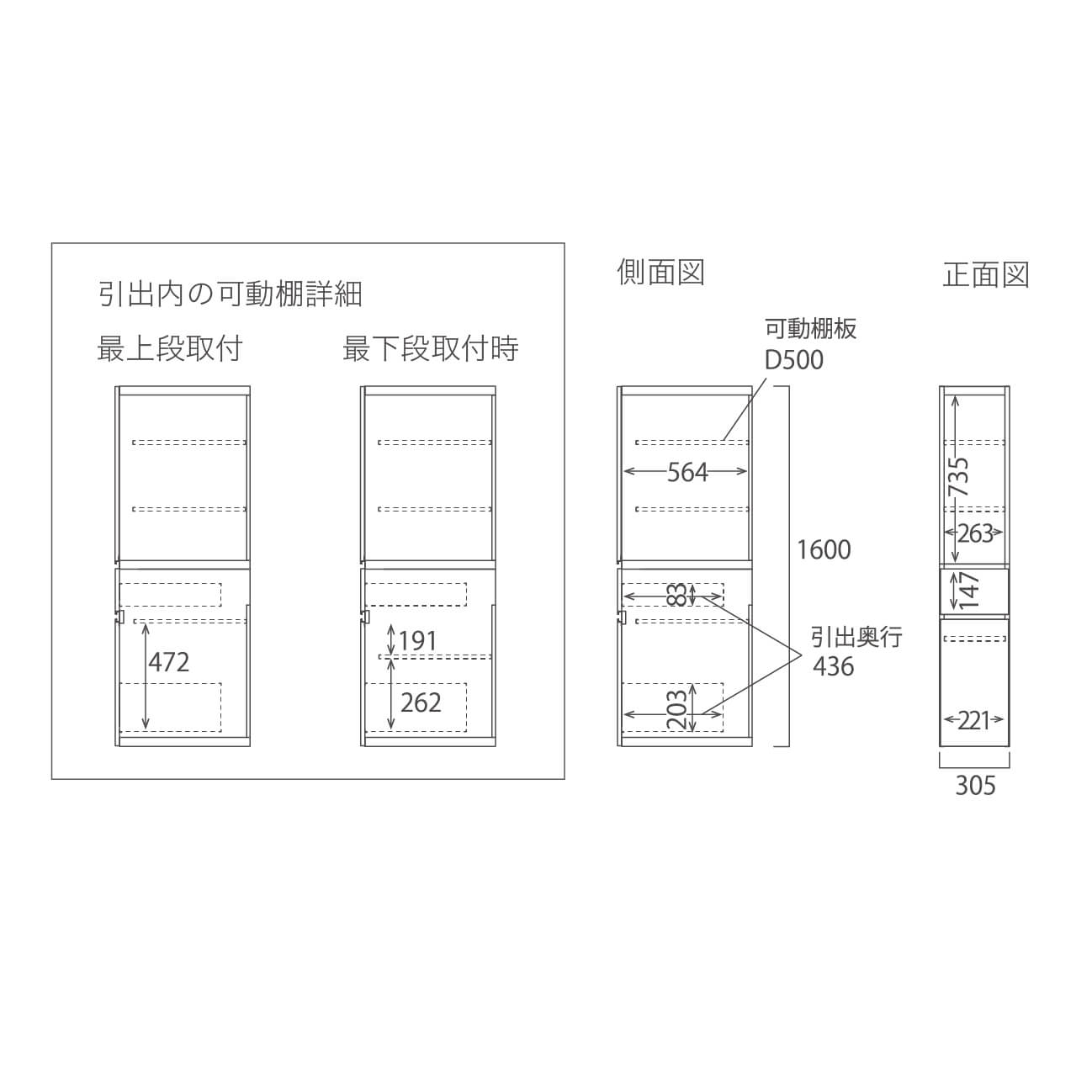 扉内部には可動棚板が2枚、引出にも1枚付属します。