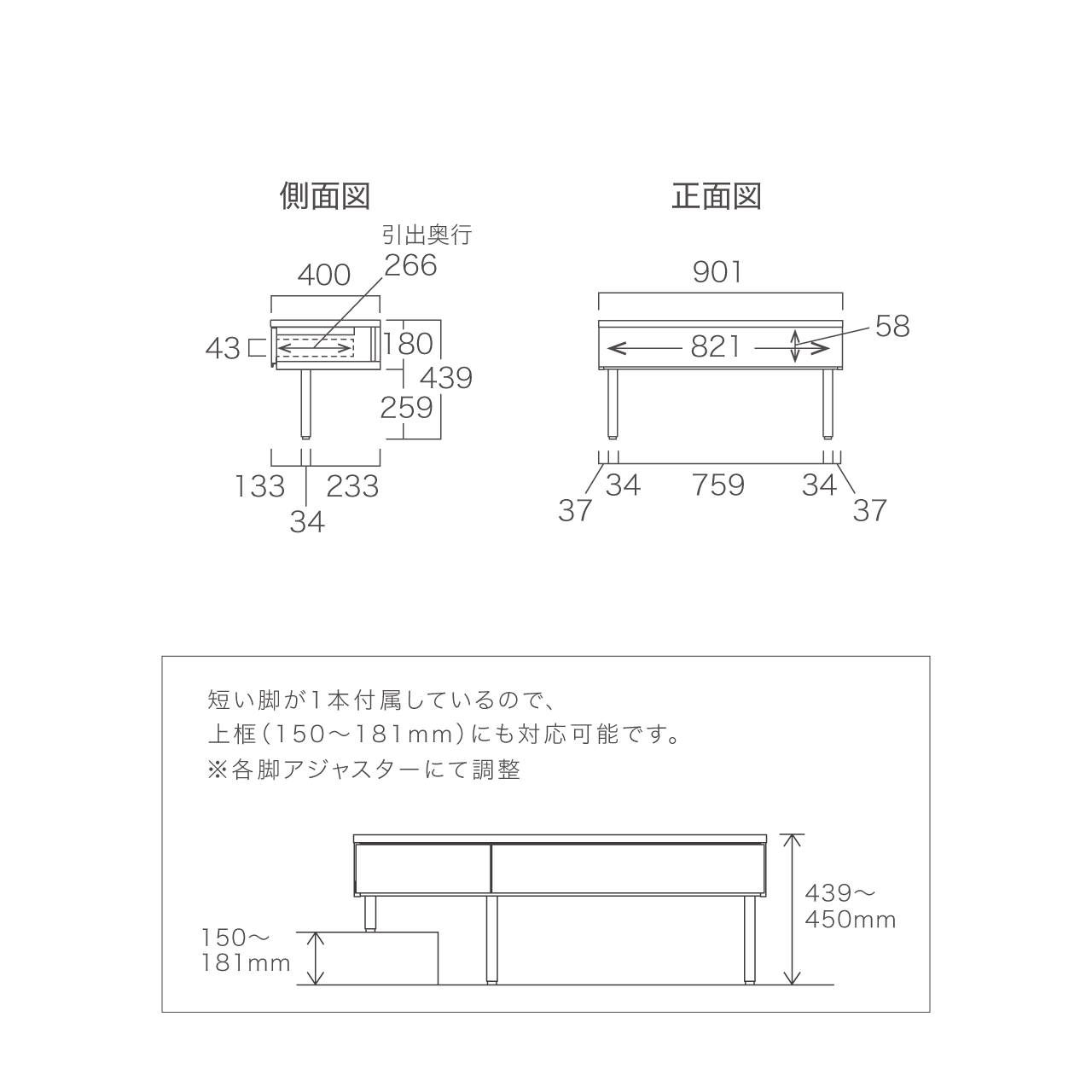 また短い脚が1本付属しているので、上框(150~181mm)にも対応可能です。