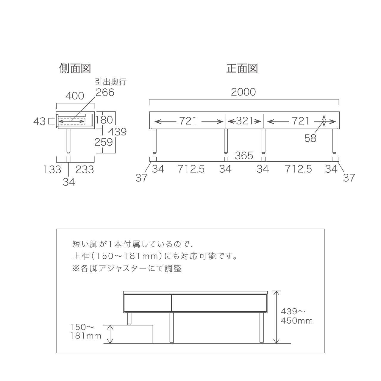 また短い脚が1本付属しているので、上框(150~181mm)にも対応可能です。